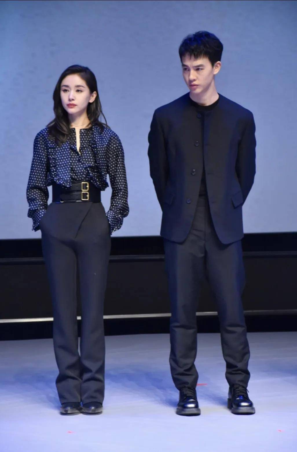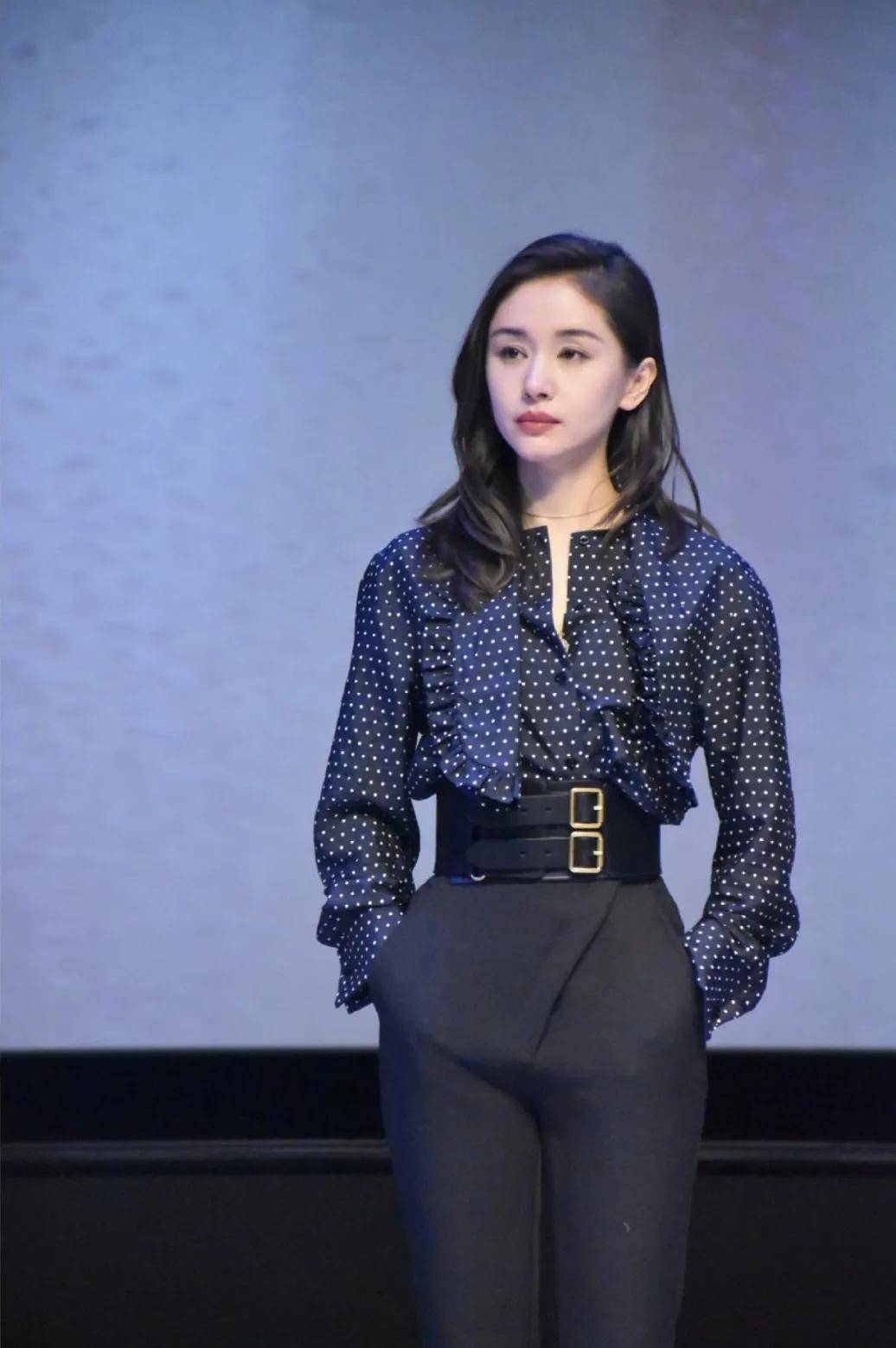 《温柔壳》映后见面会,深蓝色波点荷叶边衬衣搭配黑色长裤,简约干练,束腰装饰把身材比例衬托得非常好。